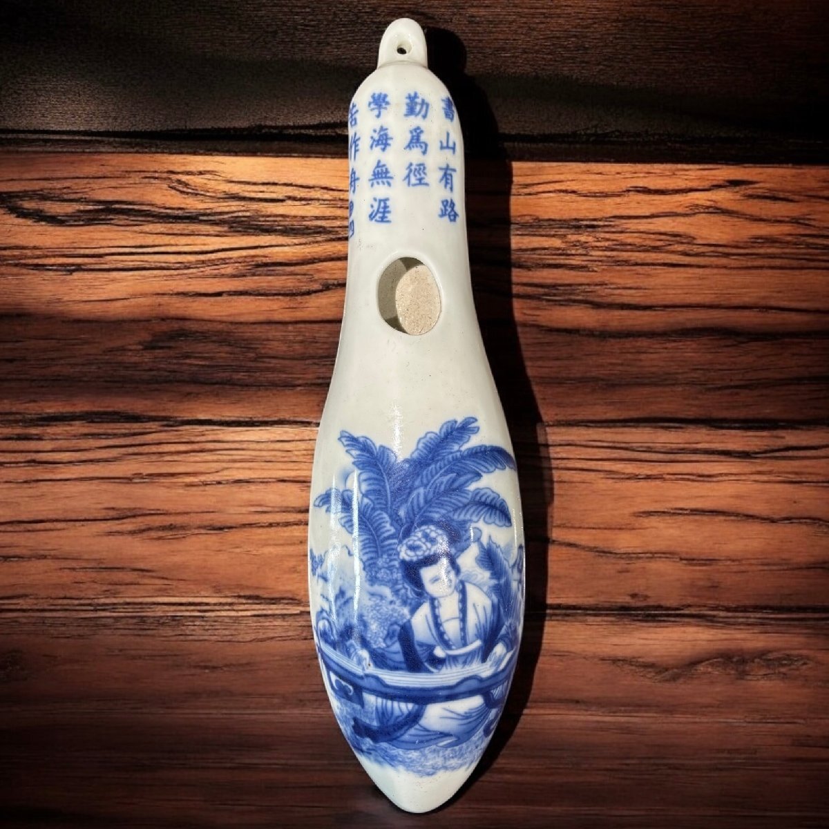 - 【FU10】中国現地買入 一輪挿し [琴女人絵] 壁掛け 中国雑貨 花瓶 フラワーベース 染付 陶磁器 陶器 骨董品 アンティーク