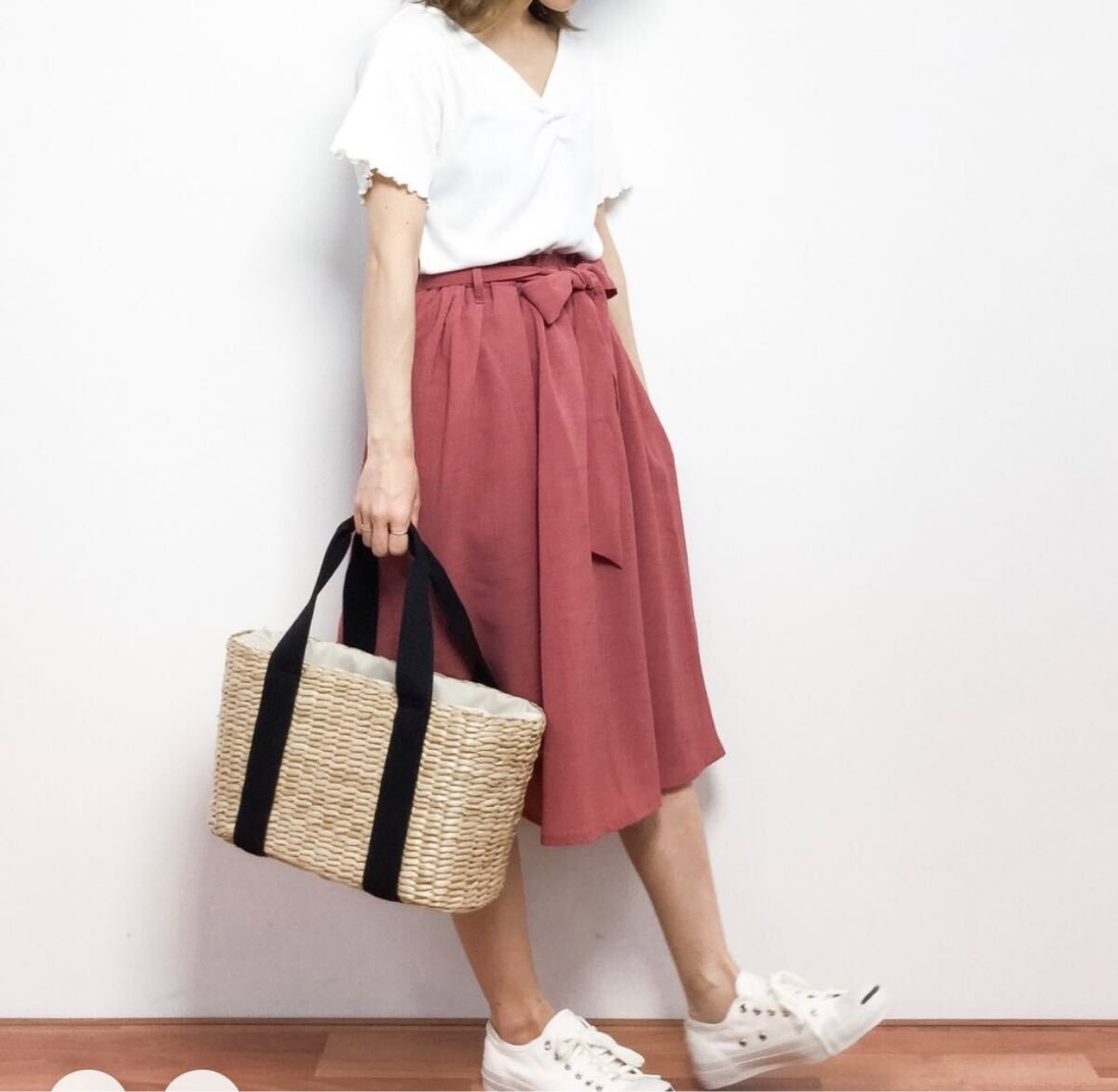 > ハニーズ グラシア 膝丈スカート ウエストリボン フレア オフィスカジュアル 赤 ピンク オレンジ レッド ニュアンスカラー M ユニクロ