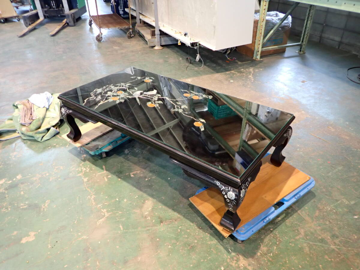- 042008 螺鈿の座卓 柿の木 野鳥 幅1360奥行700高さ380㎜ ガラスカバー付き ガレージ車庫倉庫事務所に 直
