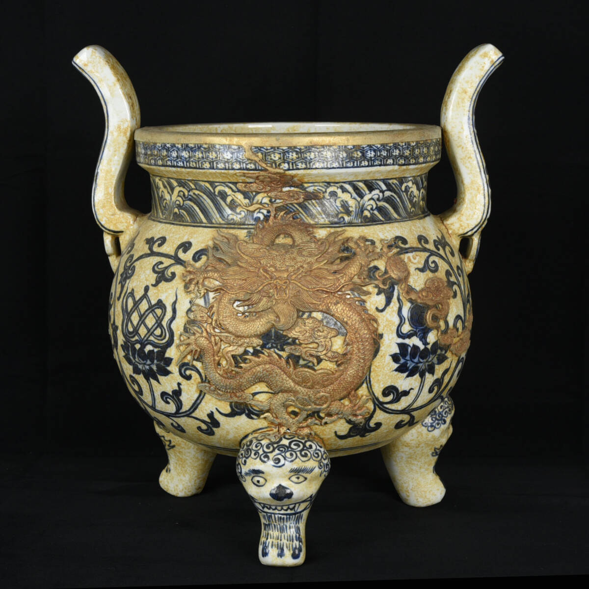 - ◆旧家蔵出◆古美術 中国古玩 大明宣徳年製款 青花 高浮雕 龍紋 獸面三足香炉 細密細工造 置物 擺件 古賞物 骨董 時代物 T16