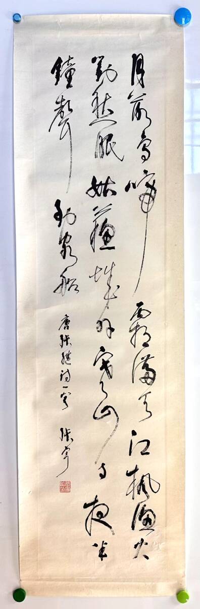 > F106『肉筆』張寧【張継 楓橋夜泊】書 草書 書道 書法 毛筆 紙本 中国美術 掛軸 額 在銘 落款 現状品 サイズ:約39.5㎝ x 138.5㎝『模写』