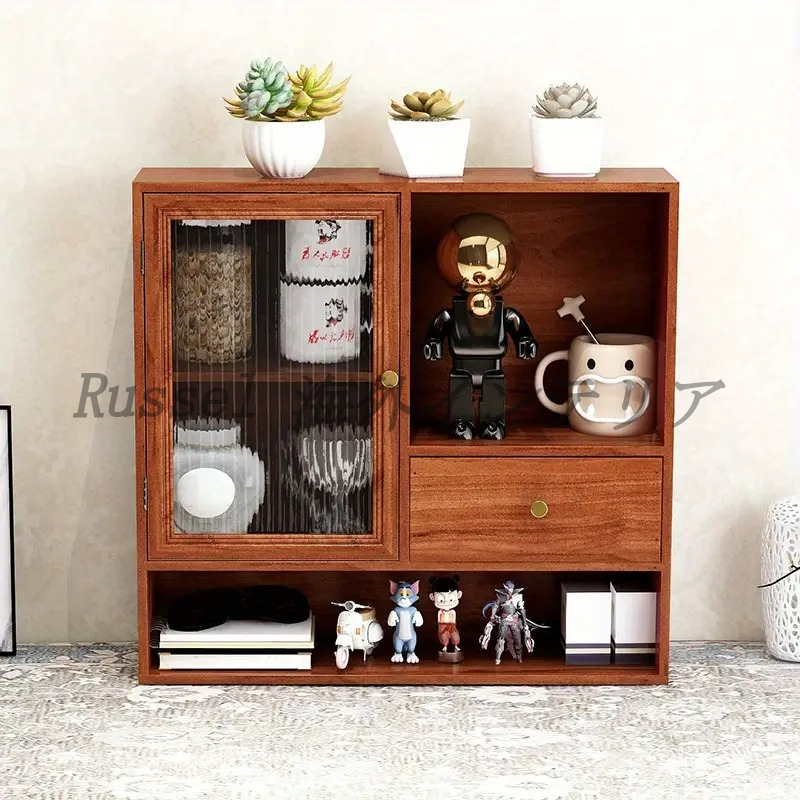 - キャビネット 無垢材格 ガラス収納 木製 シンプル オーガナイザー 引き出し付き チェスト キッチン リビング 食器棚 収納 大容量 4-7