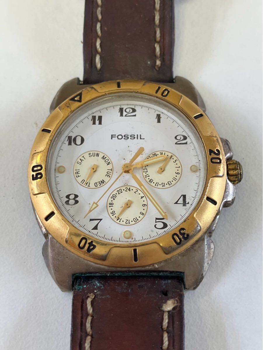 - 【中古品】FOSSILフォッシル 腕時計 クオーツ シルバー×ゴールド レザーバンド クロノグラフ 白文字盤 現状品