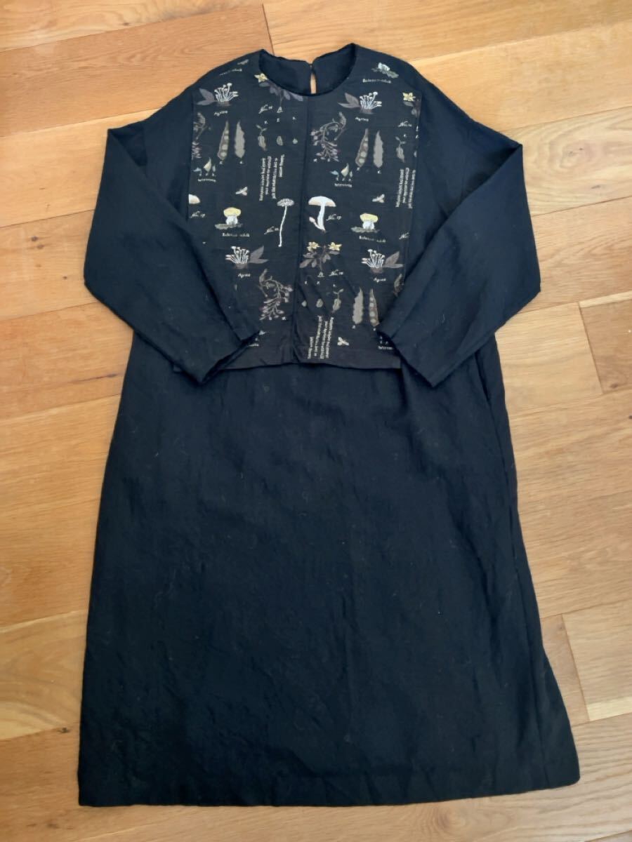 > 美品 ANTIPAST アンティパスト ★ ボタニカル柄 切り替え デザイン ウール混 ワンピース 2 ブラック 黒 完売 ストレッチ