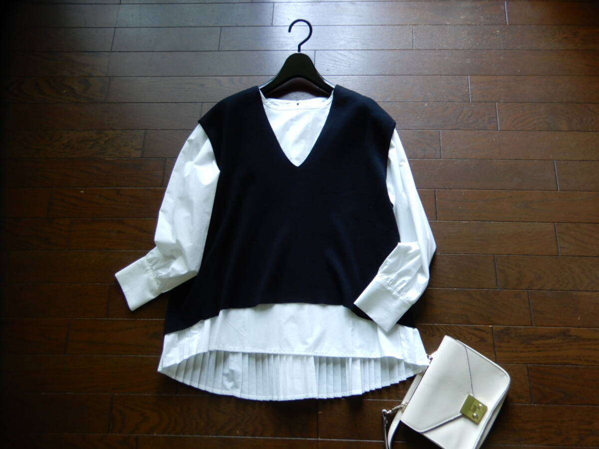> 【Vin/ヴァン】バックプリーツも大人可愛いコットンブレンド長袖ブラウス レイヤードニットベストのセットアップ スコットクラブ系