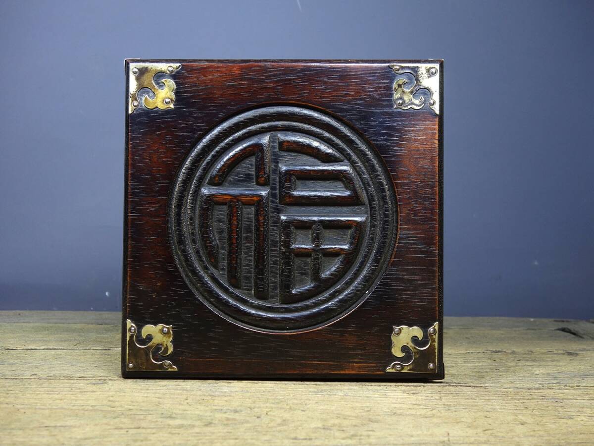 - 【超珍館蔵】花梨木製 細密彫 包銅 福在眼前紋 首飾盒 置物 賞物 古賞物 古美術品 稀少珍蔵品
