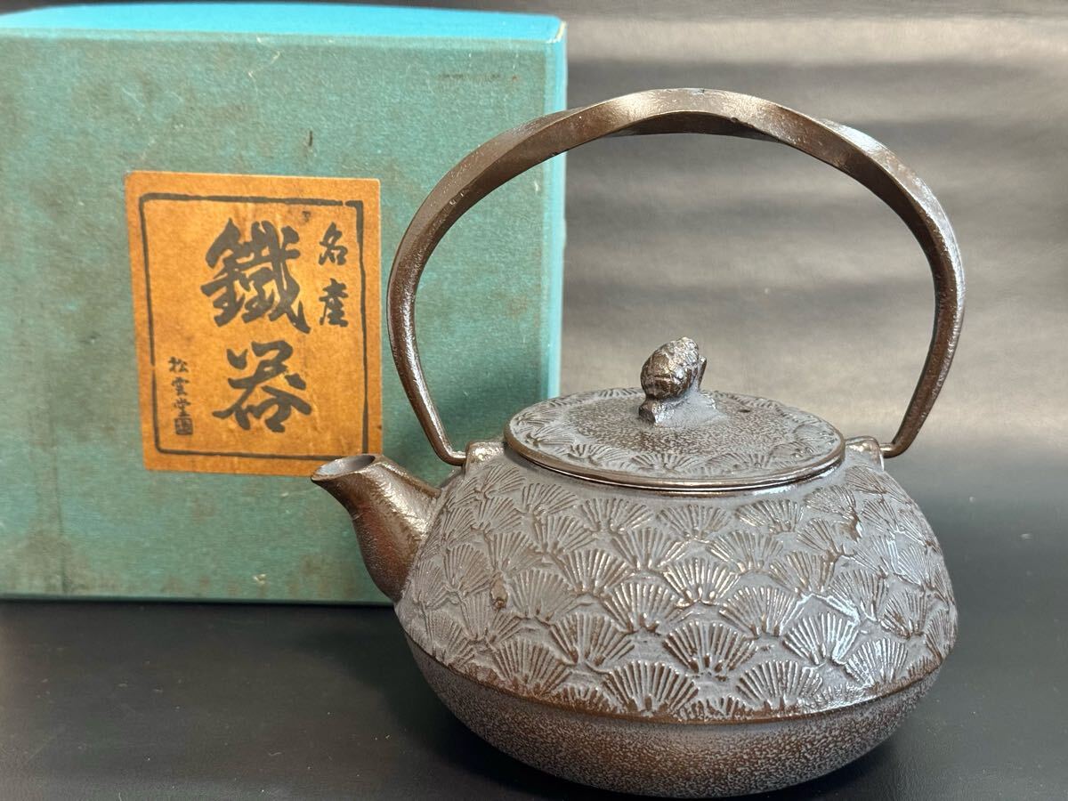 - 南部 名産 南部盛岡 鐵器 鉄瓶 茶道具 急須 扇 松 工芸品 松雲堂 松ぼっくり 丸善 急須 鉄器 アンティーク 茶こし付き 金属工芸 鉄瓶 在銘
