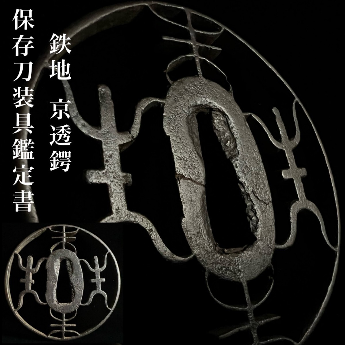 - ◇鸛◇ 刀剣美術 保存刀装具鑑定書 時代 鉄地 無銘 京透 文字透丸形鍔 7.75cm 74.5g 地透 丸耳 桐箱付 鐔 刀装具 太刀 刀剣武具骨董
