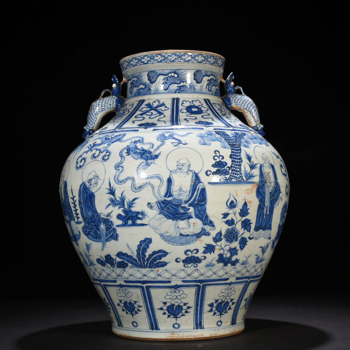 > ◆旧家蔵出◆古美術 元時代 元青花 十八羅漢人物図双耳大罐 細密細工造 置物 擺件 古賞物 骨董 時代物 A33