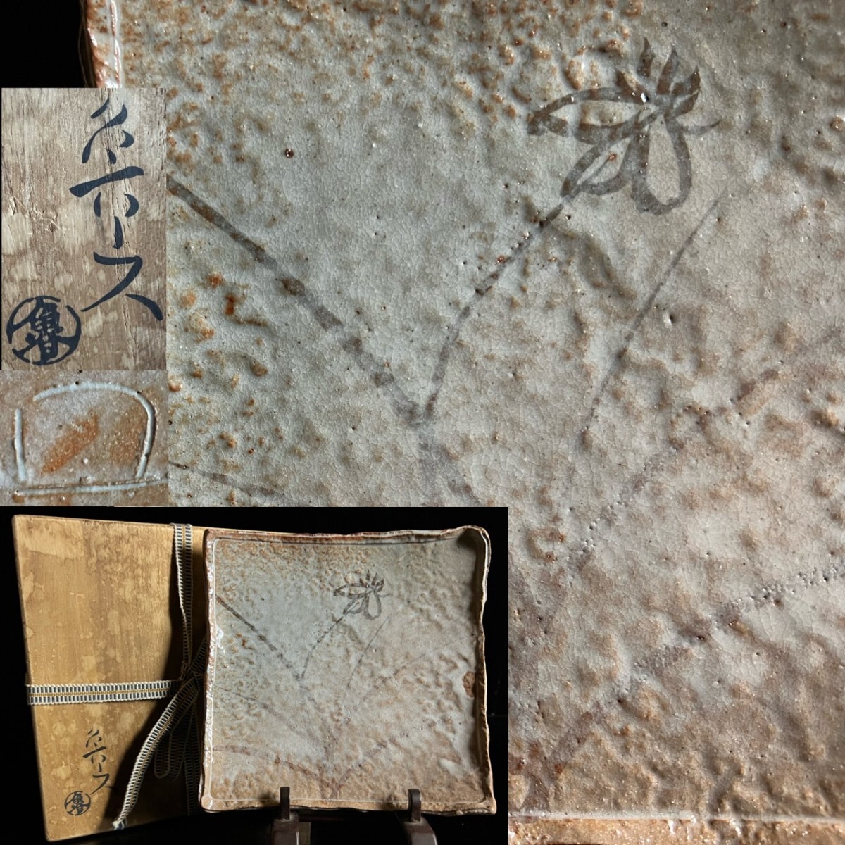 > ◇鸛◇ 古美術品 北大路魯山人 鼠志野 草花文四方平行皿 19.5cm 共箱 釉薬に指跡が付いた作品 時代 紅志野 唐物骨董