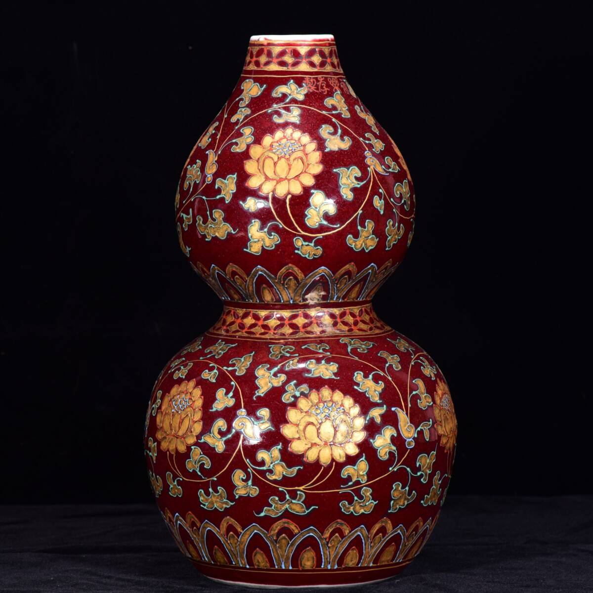 - ▽鴻▽ 明 永樂年製款 霽紅 加彩 描金 纏枝蓮紋 ひょうたん瓶 古陶瓷品 置物 古賞物 中国古玩 中国古美術