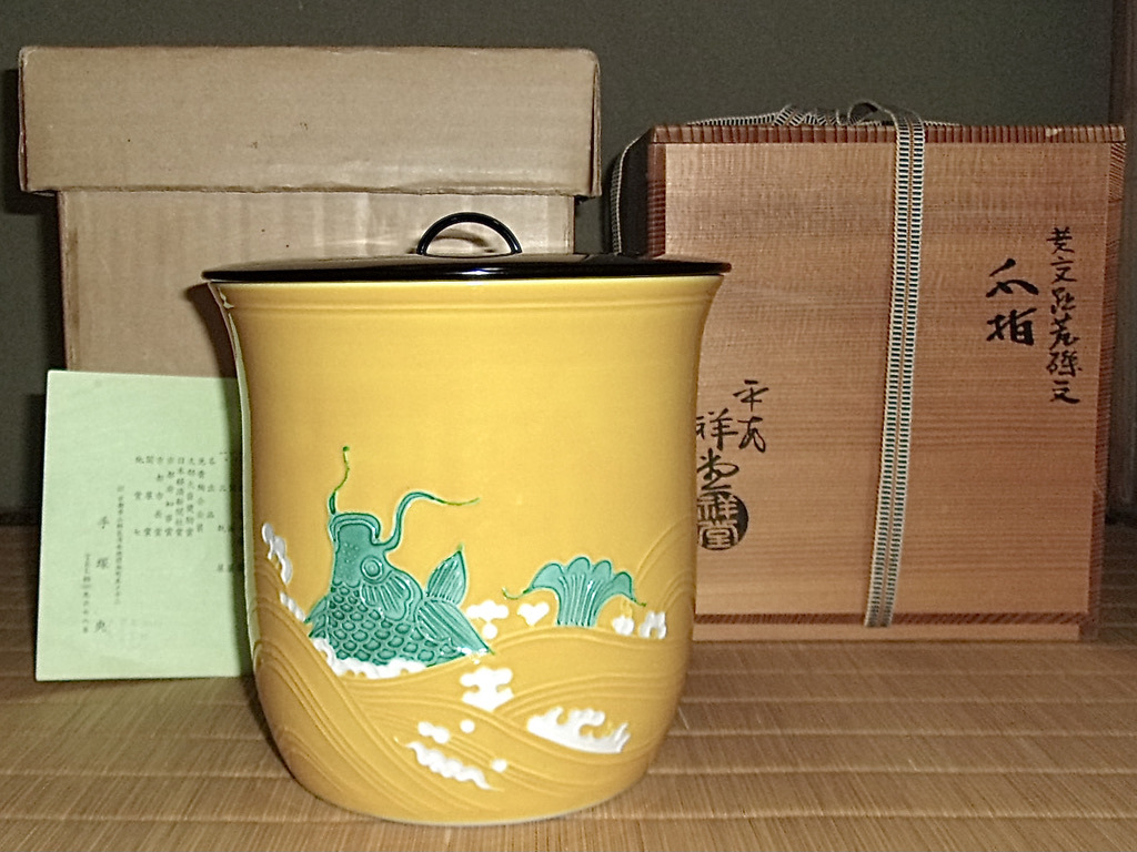 - 黄交趾荒磯文 水指 共箱 手塚央 平安祥堂 黄色- 茶道具 皆具
