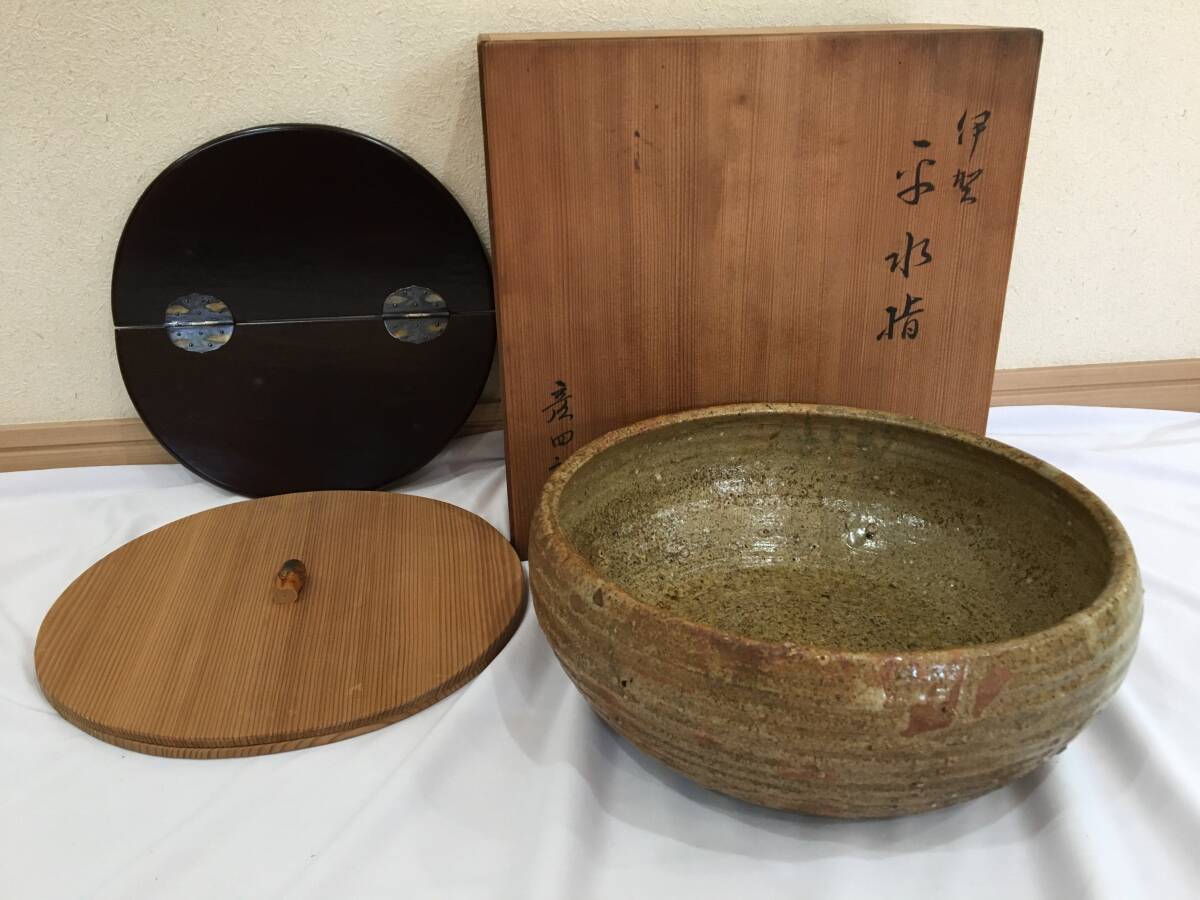 > f1181 美品 西尾彦四郎作 伊賀平水指 共箱 水差 建水 割蓋付 花入/蓋置/茶道具/水器/ 鉢 18.5x10.5cm[飛脚便100]