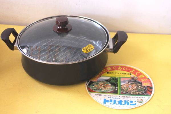 - 未使用品 サンコーウエアのトリオパン ホーロー両手鍋 ガラス蓋付き 底厚1.2㎜/25N5.1-76