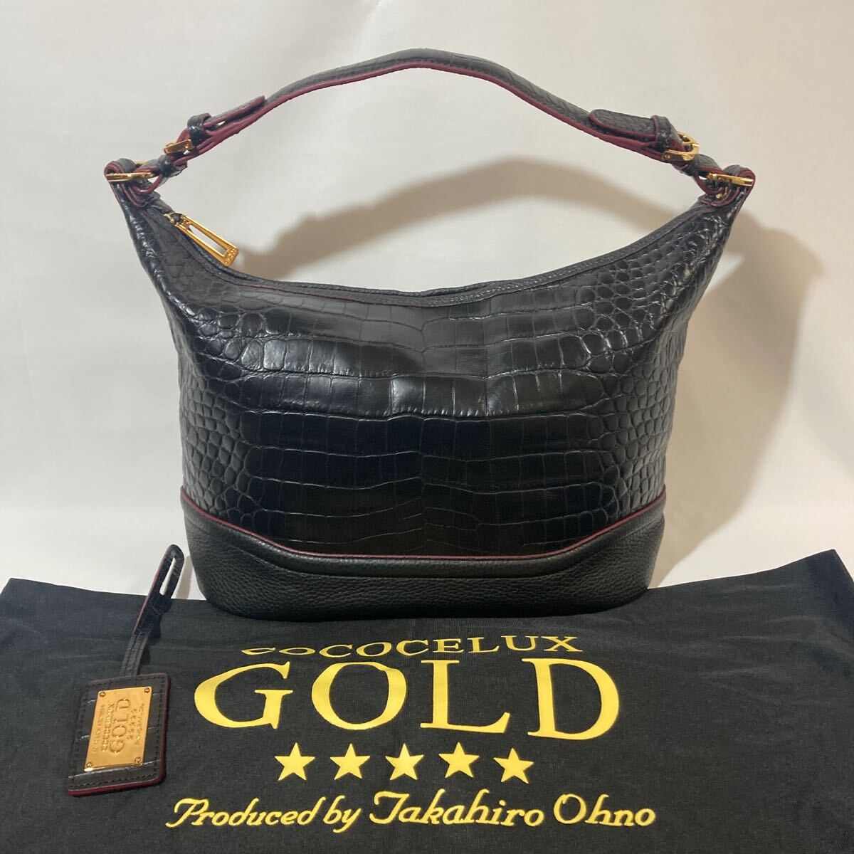 - ココセリュックスゴールド ハンドバッグ クロコダイル型押し イタリアンレザー ブラック COCOCELUXGOLD