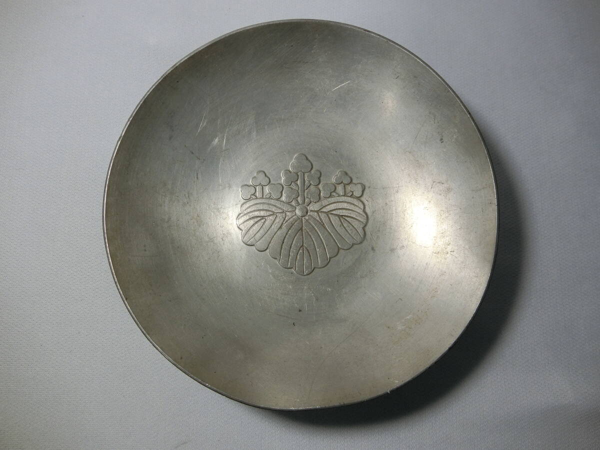 - 五三の桐 家紋 五三桐 ごさんきり 錫半 精錫 錫盃 約140g 直径11.5cm 記念杯 縁起物 酒器 中古品