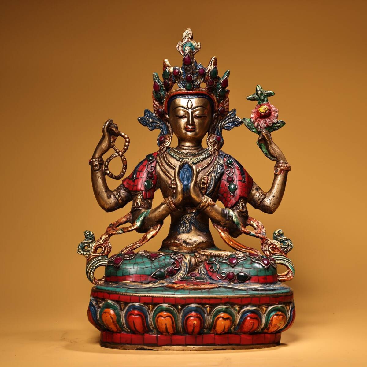 - ▽鴻▽ 銅製 寶石嵌 描金 彩繪 四臂觀音像 仏教古美術 供養品 古賞物 中国古玩 中国古美術