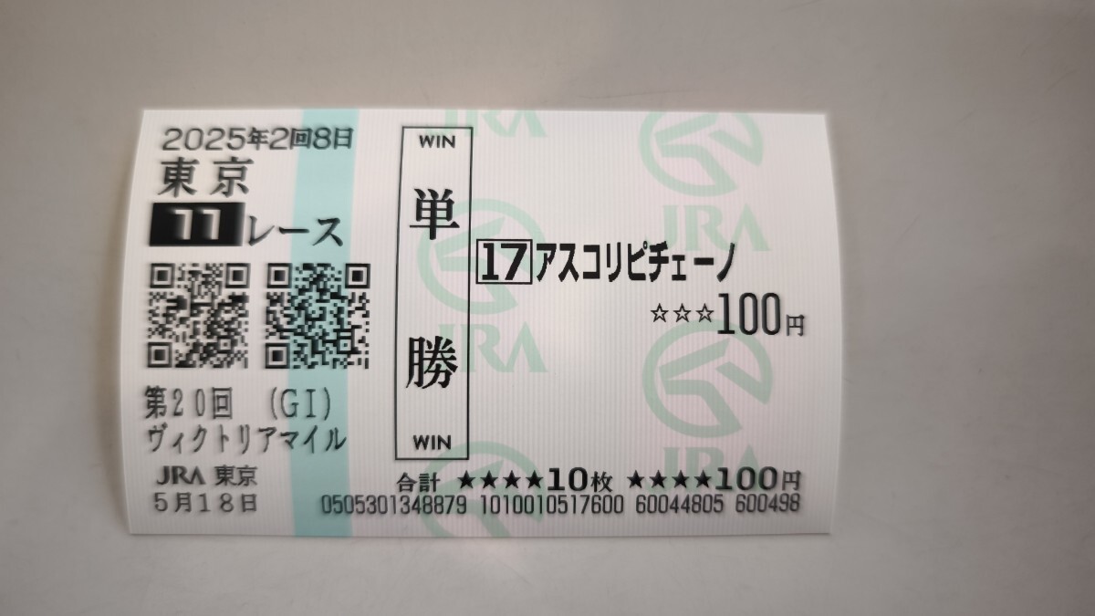 - 第20回ヴィクトリアマイル 優勝アスコリピチェーノ 現地的中単勝馬券