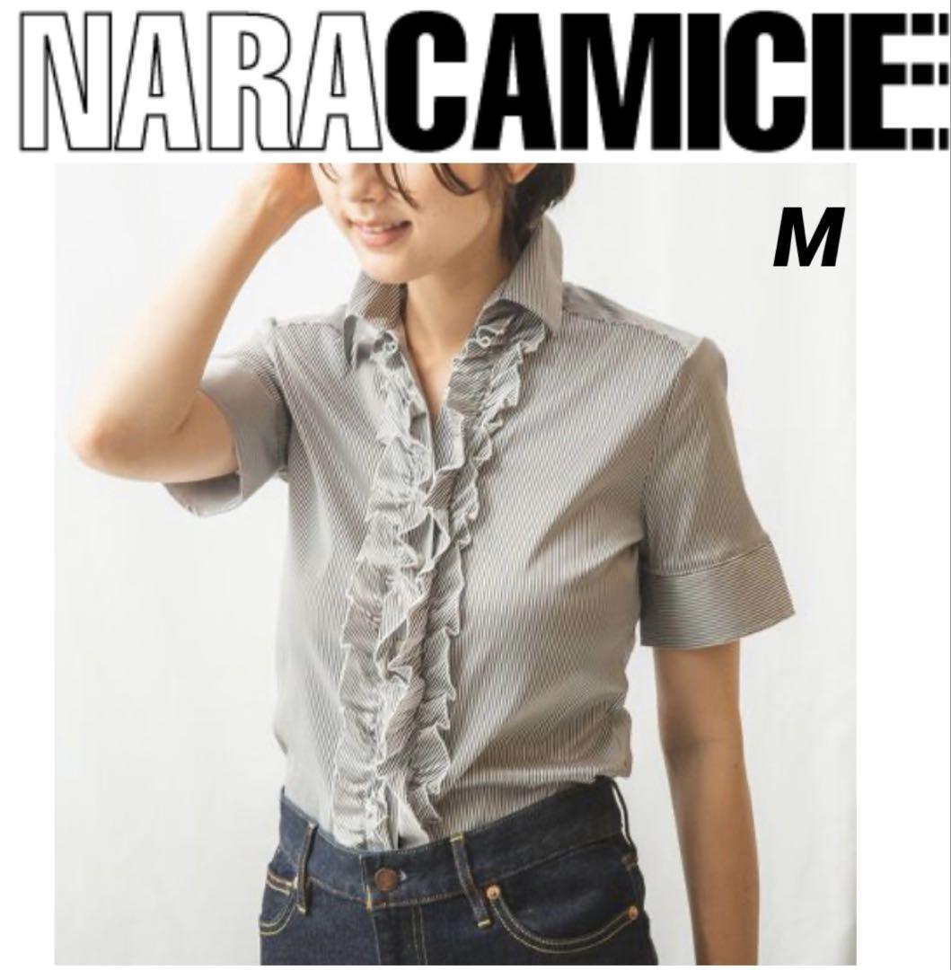 - NARACAMICIE ナラカミーチェ 細ストライプ 襟付きフリル ストレッチ 半袖シャツ M レッド系