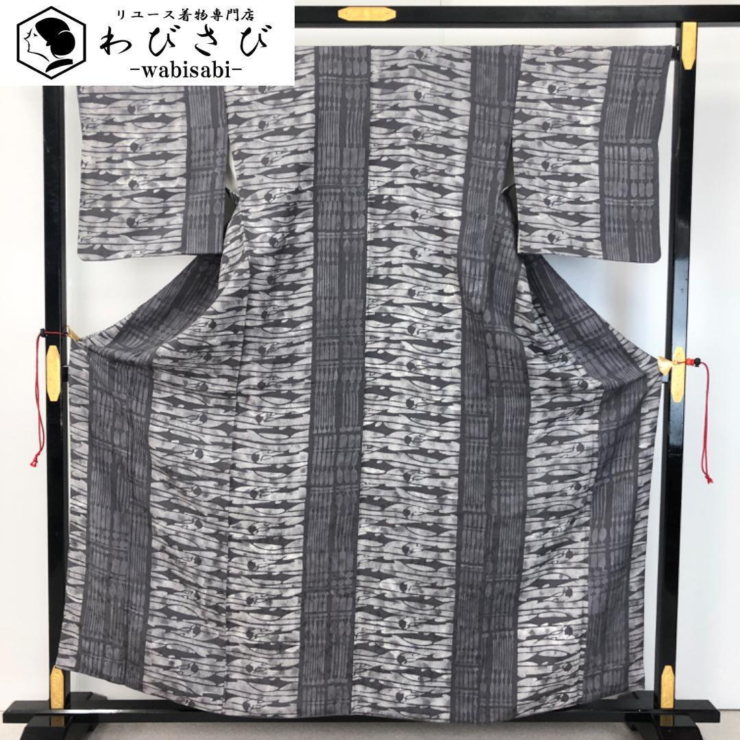 > 小紋 縦縞模様 モダンな抽象柄 燻銀色 縮緬 ガード加工 K-4748 着物 きもの kimono 和服 和装 中古 リサイクル着物 【送料無料】