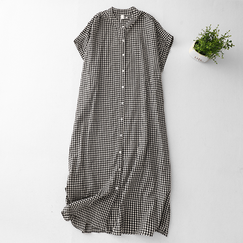 - 新入荷*大きいサイズ ロング丈ワンピース カジュアル ゆったり 綿麻 ワンピース チェック柄 着やせ 半袖 シャツワンピース 復古風