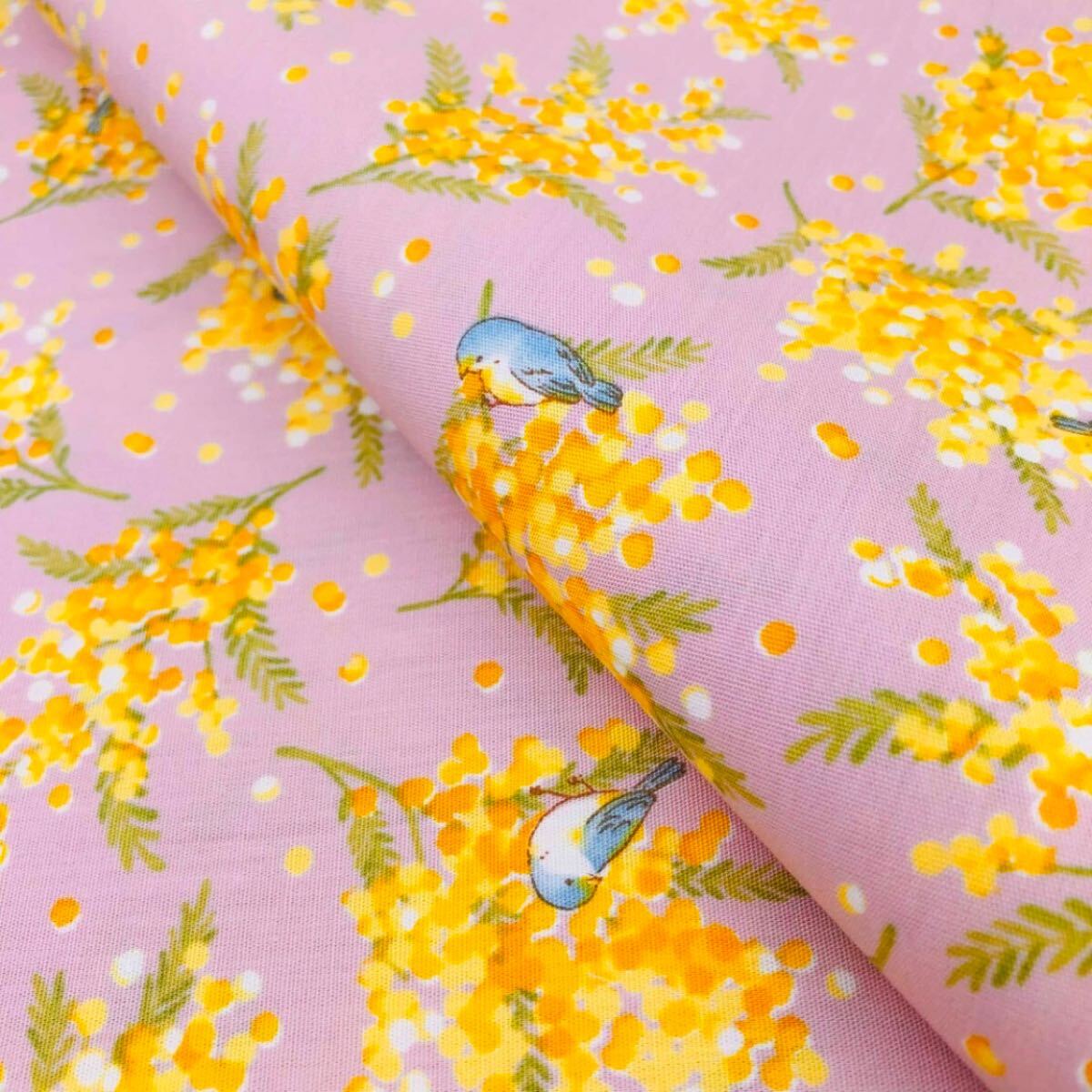 - はぎれ 50cm ミモザ 日本製コットン ブロード 生地 ハギレ ピンク コットン 小鳥