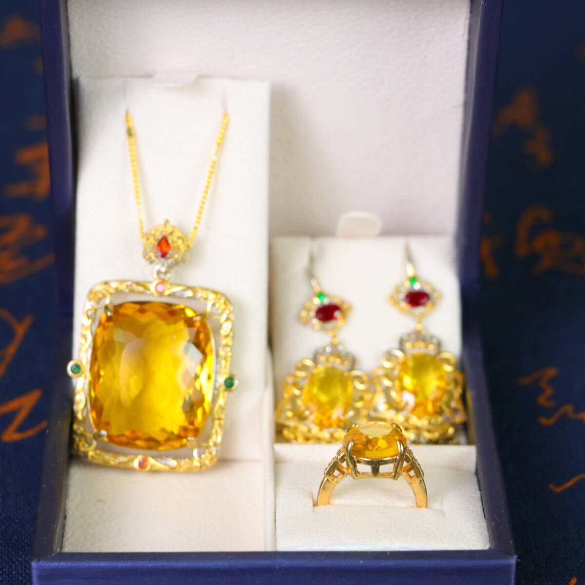 - 清 宮廷御製 古高冰寶石嵌 黄寶石 項鏈 戒指 耳釘 三件套 箱付 極細工 東洋彫刻 中国唐物 骨董品 古賞物 中国古玩 中国古美術