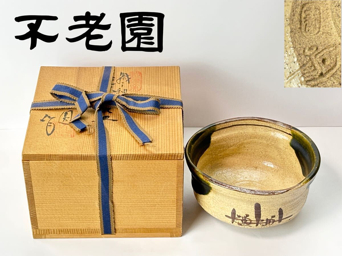 - C2533 時代物【不老園】作 織部釉 茶碗 共箱