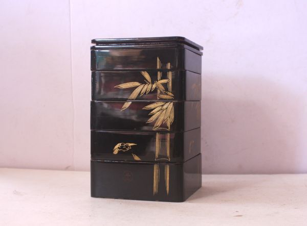 - レトロ 木製漆器 お重 5段重 重箱 蓋2枚 竹 木箱入 小物入れとして/25N4.17-54