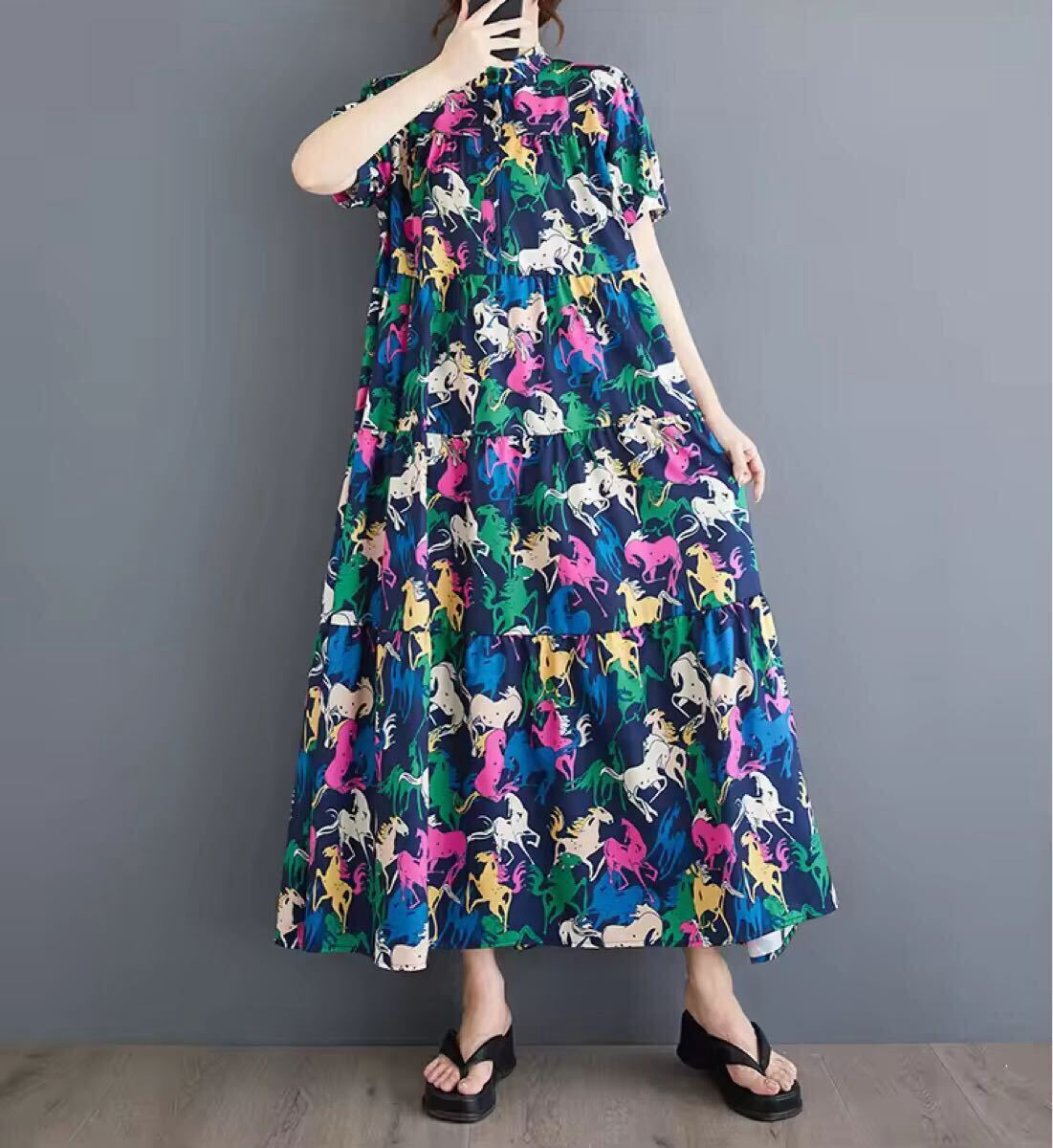 - ティアードワンピース ロング丈 フリーサイズ 半袖 馬 ウマ 総柄 レディース 夏ファッション