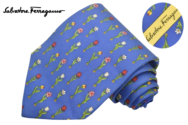 - N-2885★送料無料★超美品★Salvatore Ferragamo サルヴァトーレ フェラガモ★イタリア製 ブルー青色 チューリップ 花柄 シルクネクタイ