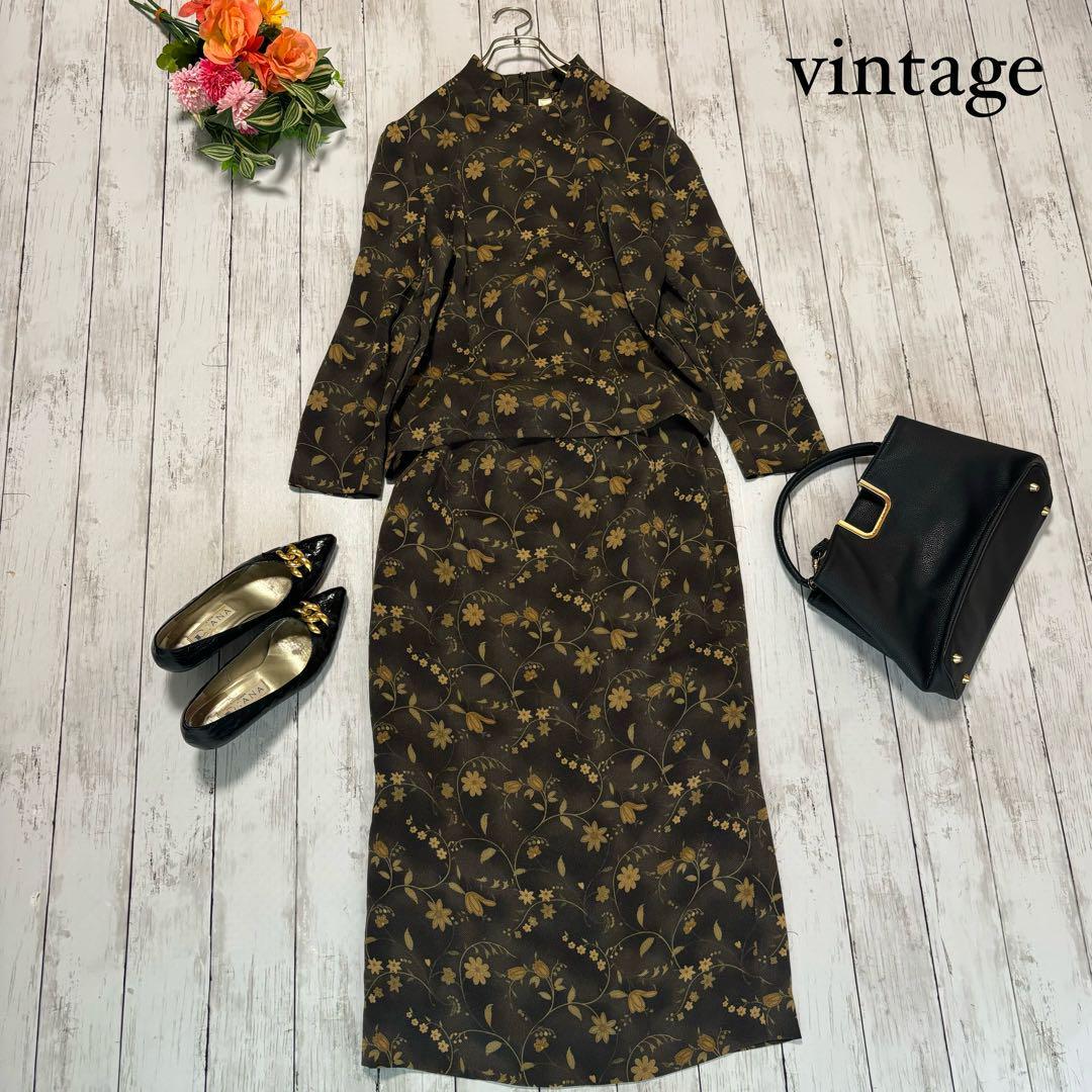 - vintage レトロ古着 セットアップ 11号 総柄 花柄 ブラウン 婦人