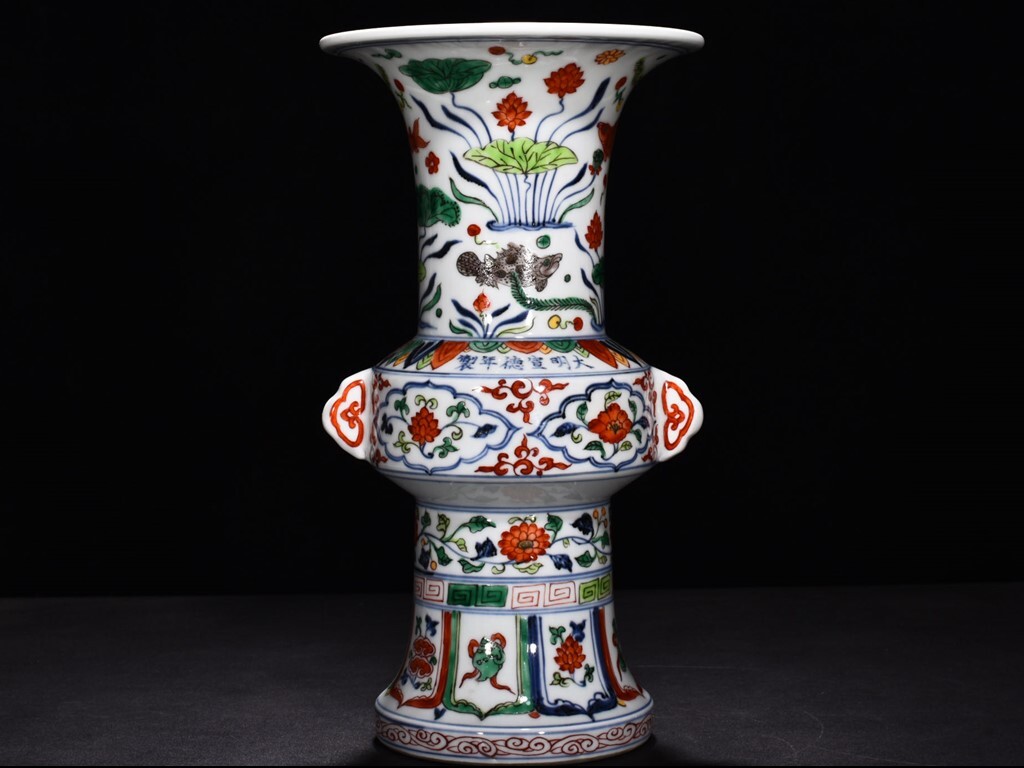 > TB103■中国古玩 唐物 明宣徳 五彩魚藻紋花觚 時代物 極上品■ 高さ32.5cm・直径17.5cm■