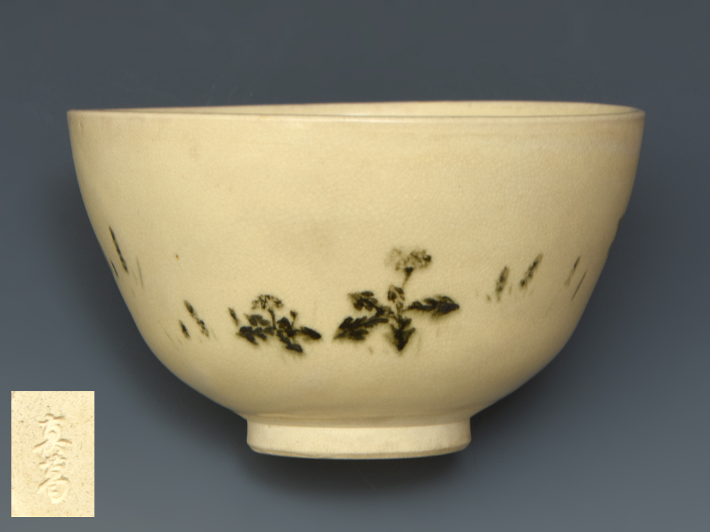 > 真葛窯 宮川香斎(作) 春草文茶碗 箱付 茶道具 陶磁器 古陶磁器 京焼 u0223o