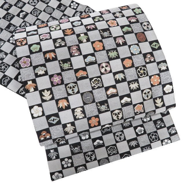 - 袋帯 中古 リサイクル 正絹 フォーマル 仕立て上がり 六通 市松取り 松竹梅模様 箔糸 黒色 白鼠色 多色 金 きもの北條 A1194-10