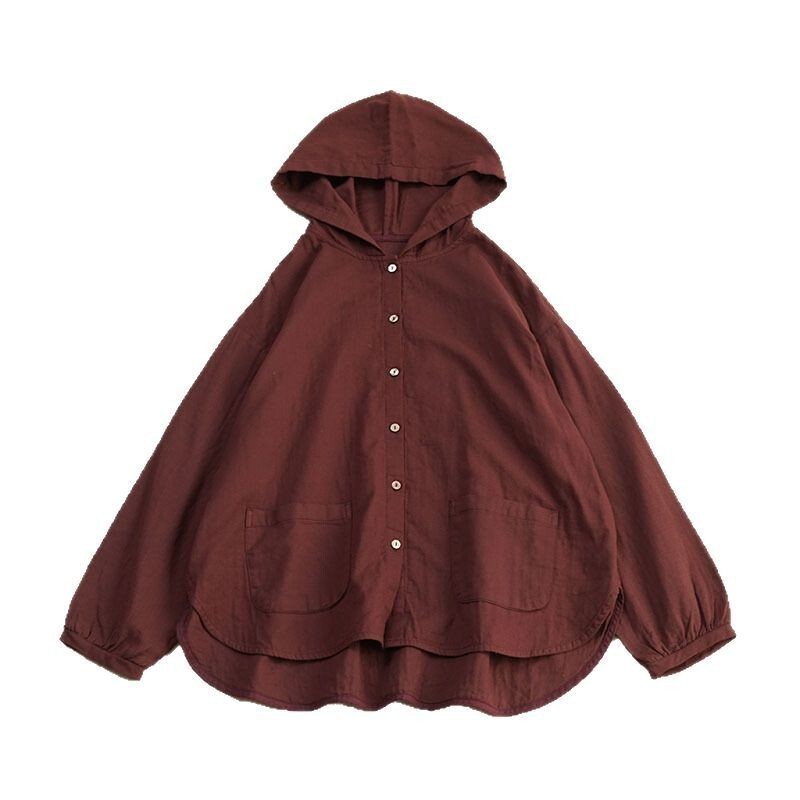 - 人気 ダブルガーゼ フード カーディガン フリーサイズ チュニック トップス ゆったり ワイシャツ 綿100% 大人可愛 ナチュラル 赤