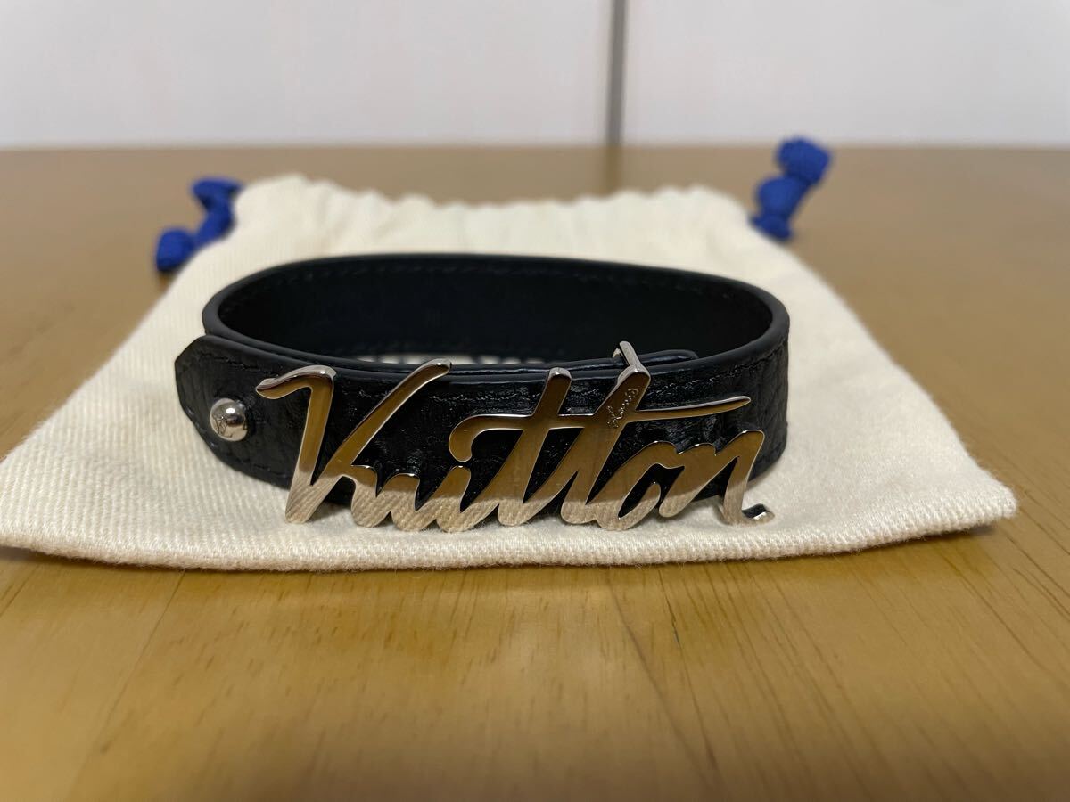- 【超レア】 ルイヴィトン LOUIS VUITTON ブレスレット アクセサリー ブラック 「VUITTON」筆記体文字 大バックル レザーベルト