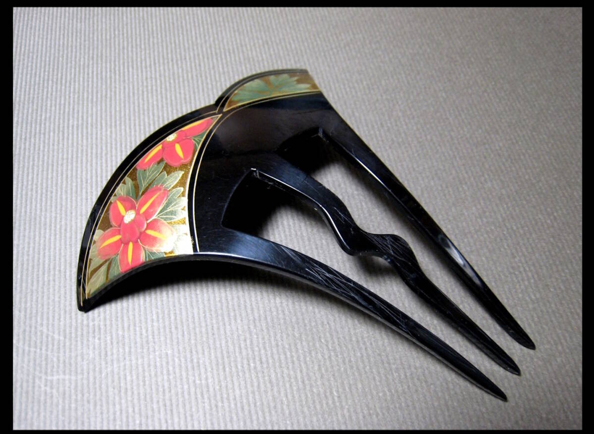 - 花 菊 絵付け 梨地 黒 バチ簪 和装 髪飾り かんざし