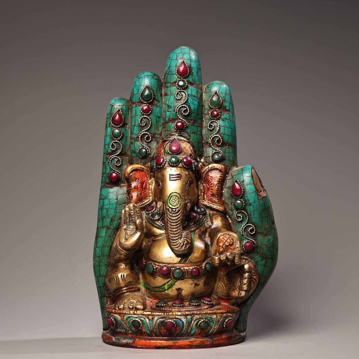 - 蔵友旧蔵出 銅製 寶石嵌 彩繪 描金 坐仏象鼻財神像 貴重品 置物 古賞物 密宗密教 供養品 仏教美術品