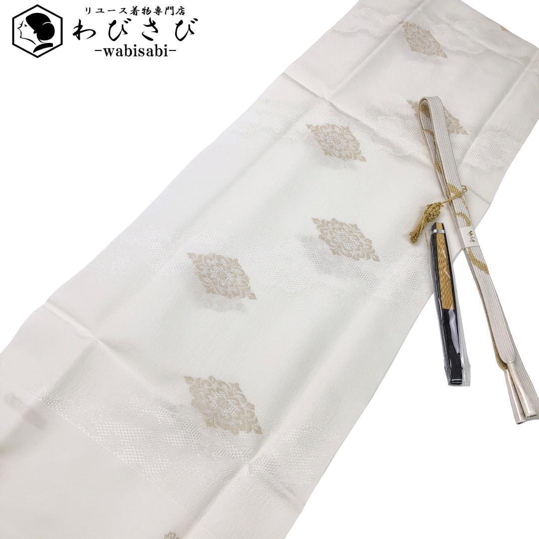乳白色のお色味に華菱模様の帯揚げ、曲線模様の柄裄がデザインされた帯締めの素敵なお品でございます。