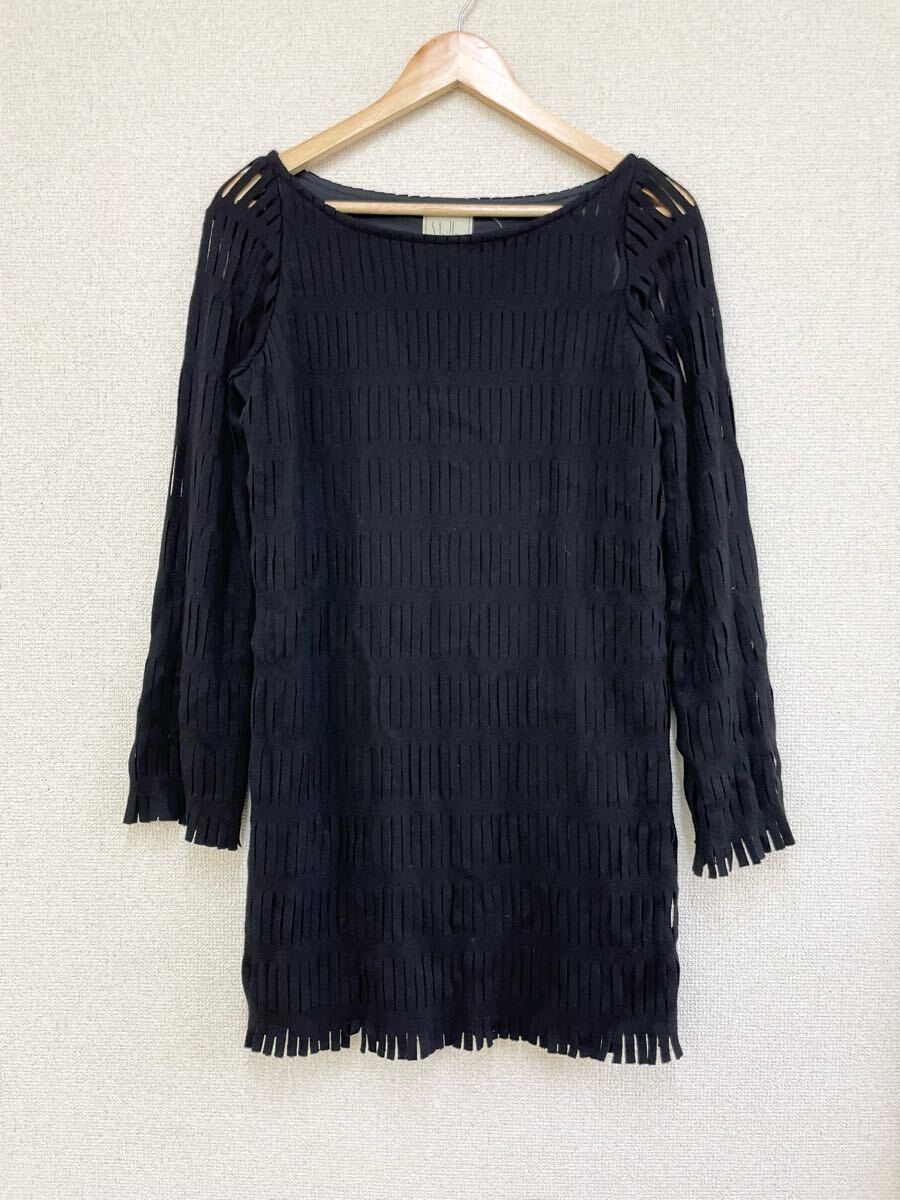 > Sybilla シビラ フリンジ ざっくりカット 奇抜 長袖 ワンピース ウール100% ブラック 40号 レディース Lサイズ