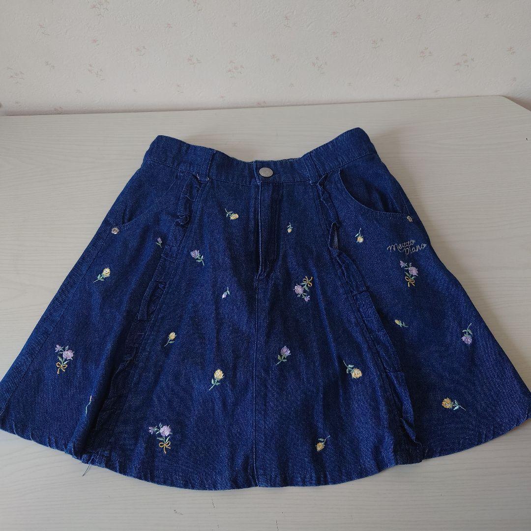 - ★美品★メゾピアノ★ジュニア★花刺繍柄★デニム★スカート★スカパン付き★インナーパンツ付き★サイズM★150★ゴムウエスト調整可能
