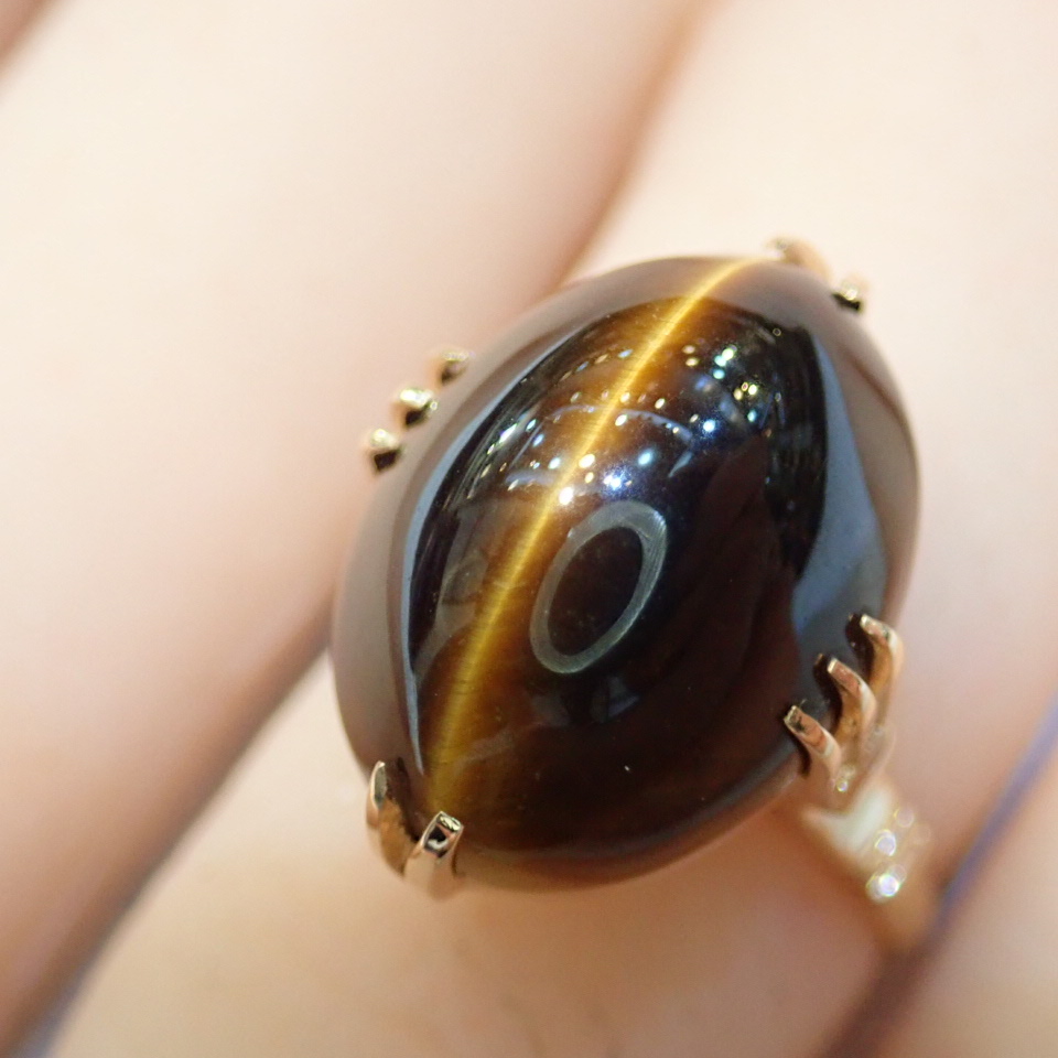 > ■K18 タイガーズアイリング(虎目石)■千本透かし(穴透かし) 割り爪■アンティーク 昭和レトロ■指輪■中古磨き仕上げ■