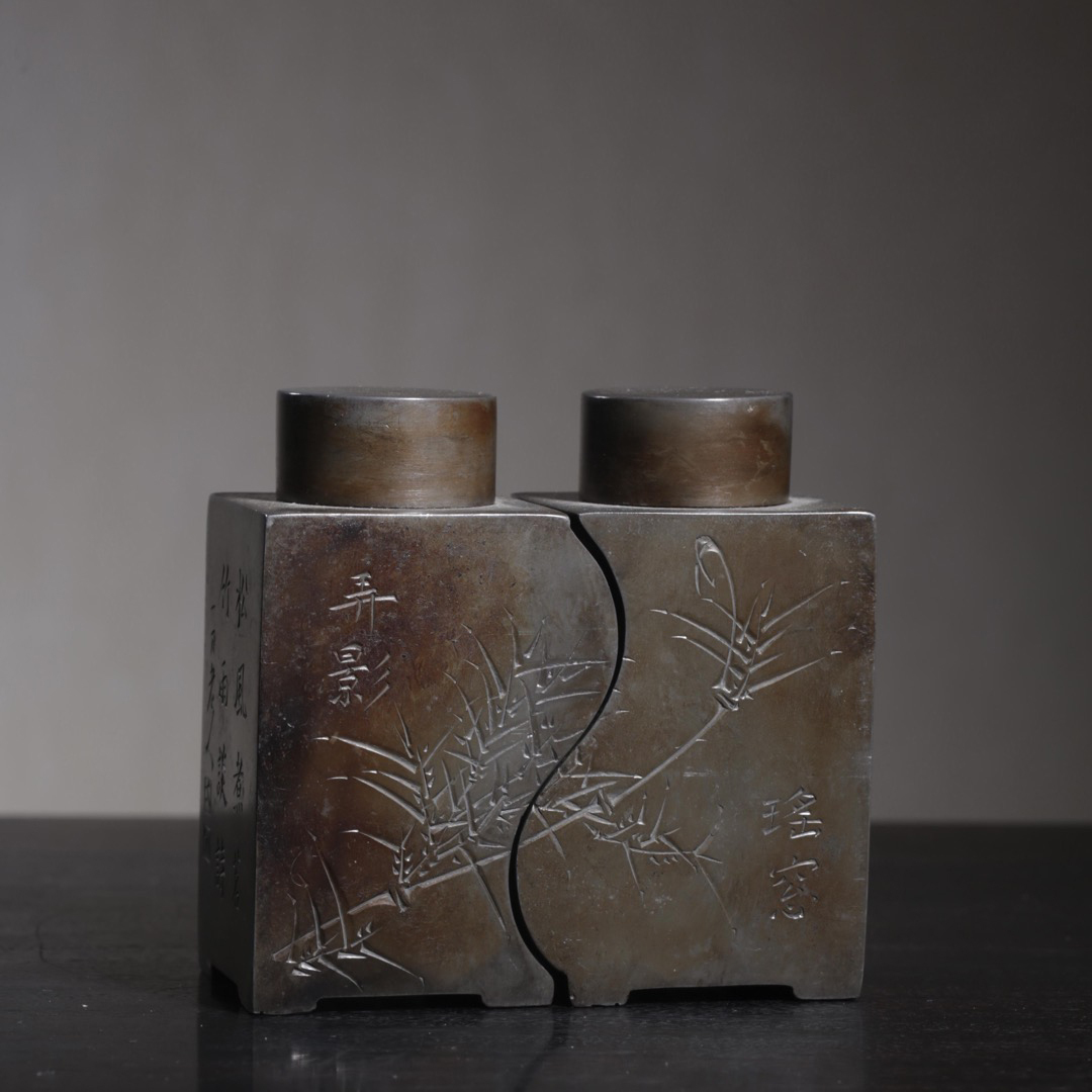 - 古錫 茶葉罐 盛永興造 「錫刻梅竹詩文茶心壺二キット」 茶筒 茶入 茶壷 茶道具 錫肌 金工 茶器 時代物 LT-250617