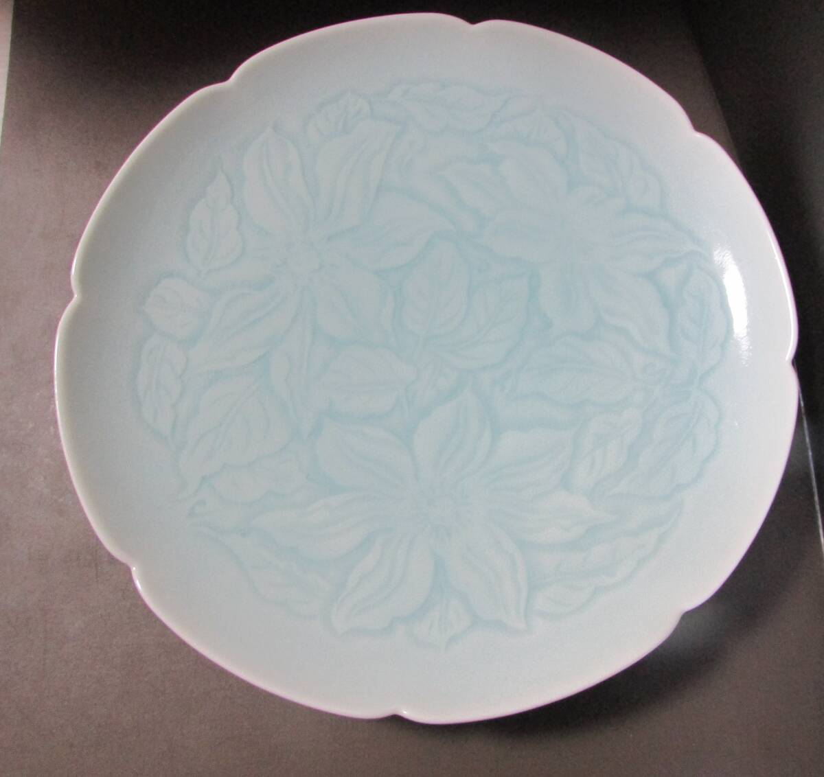 - 有田焼 青磁牡丹紋彫大皿 径:(31㎝XH4.5㎝) 刺し身盛皿 在銘④