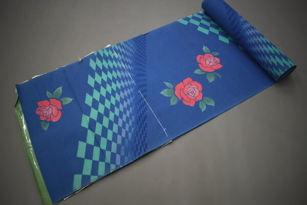 - A16-18【凛々】即決 新古品(三勝染)本染 ゆかた反物 青 バラ 未仕立て品