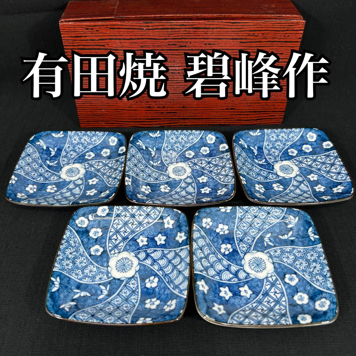 > 【未使用・保管品】碧峰作 有田焼 七宝花文 小花祥瑞 青絵皿 小皿5枚 角皿 銘々皿 箱入り 取り皿 薬味皿 醤油皿 (E156)
