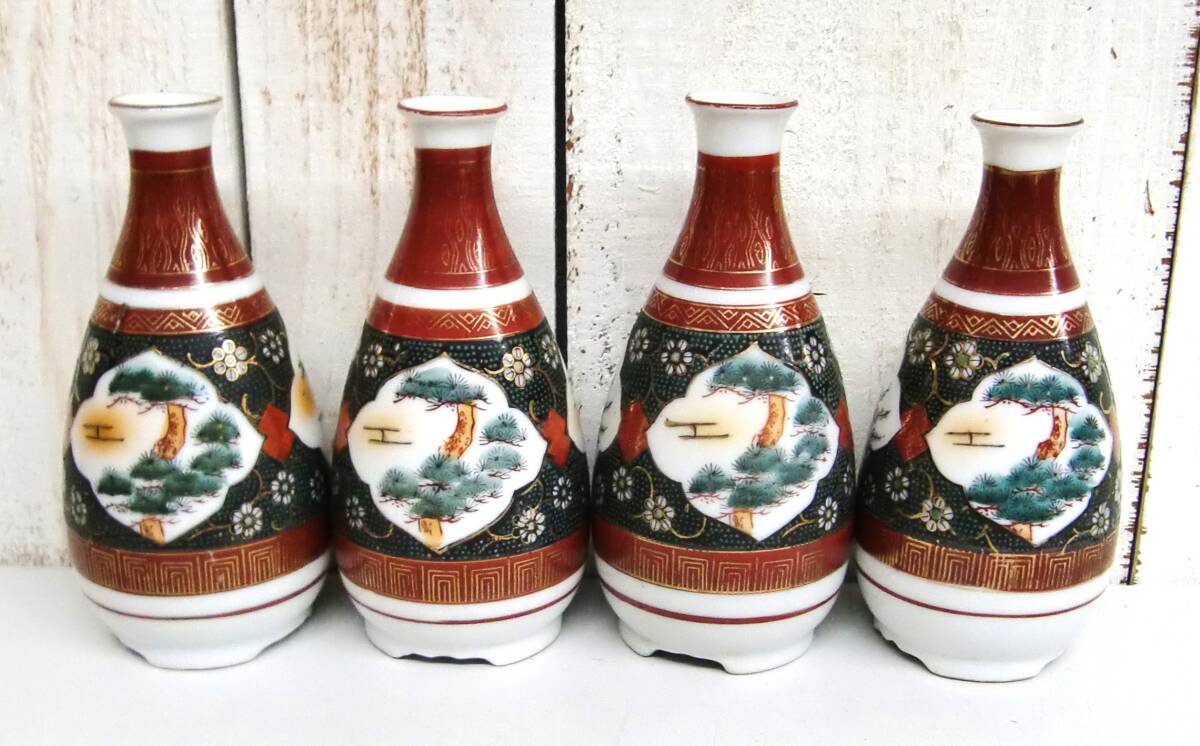 > 伝統工芸 工芸品 工芸美術 *九谷焼 *徳利 4点まとめ セット *金彩 色絵 松竹梅 酒器 *古物 古美術 古道具
