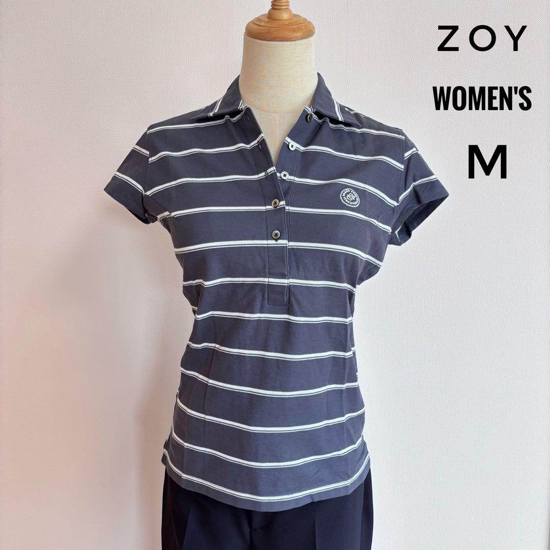 - zoy ゾーイ レディース ゴルフウェア ボーダー 半袖 ポロシャツ 刺繍ロゴ ネイビー M