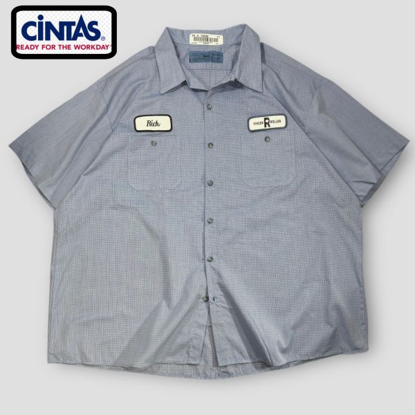 - ★BIGサイズ★FINZER ROLLERロゴ★CINTAS 半袖ワークシャツ size3XL スカイブルー系チェック柄 シンタス 古着 洗濯 プレス済み 2230